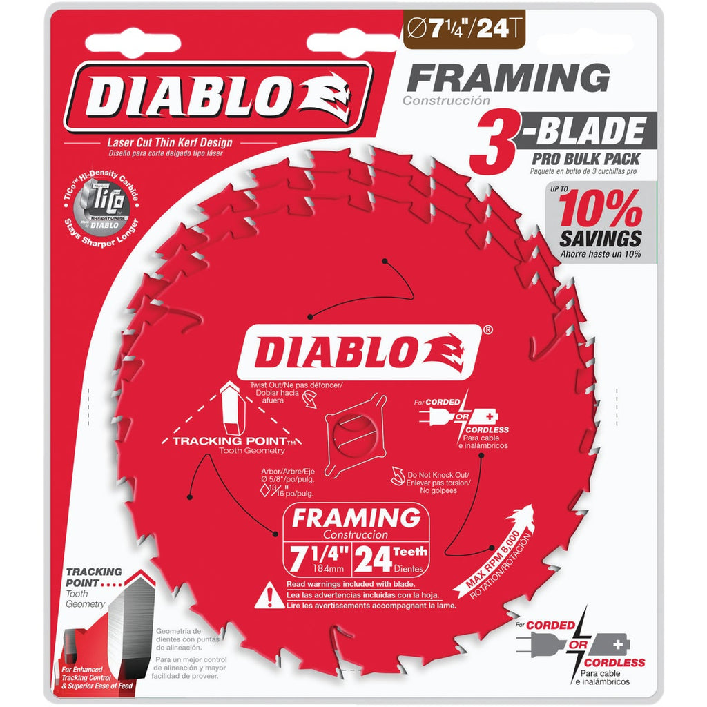 Diablo's finishing blade is ideal for smooth finish crosscuts in hardwood, softwood or plywood. These blades are the perfect choice when seeking high quality rips and crosscuts using a portable saw. The combination of Diablos application specific TiCo Hi-Density carbide teeth and a super thin-kerf blade deliver smooth cuts, increased cutting speed and longer life. A great choice for jobsite finish cuts in 1X, decking, fencing, fascia and plywood. Specially formulated Diablo TiCo Carbide withstands impact, reduces wear and lasts longer in fine finish applications. Perma-SHIELD non-stick coating protects the blade against heat, gumming and corrosion. Advanced Laser Cut Stabilizer Vents traps noise and vibration for maximum stability, keeping the blade cool with accurate cuts in wood. Super Thin Kerf Design provides less resistance and heat build-up for ease of cut, accuracy and longer cutting life. Tri-Metal Hock Resistant Brazing provides a high performance shock absorber behind every tooth. Laser Cut Arbor reduces vibration and premature wear for accurate blade rotation on cordless and corded saws.