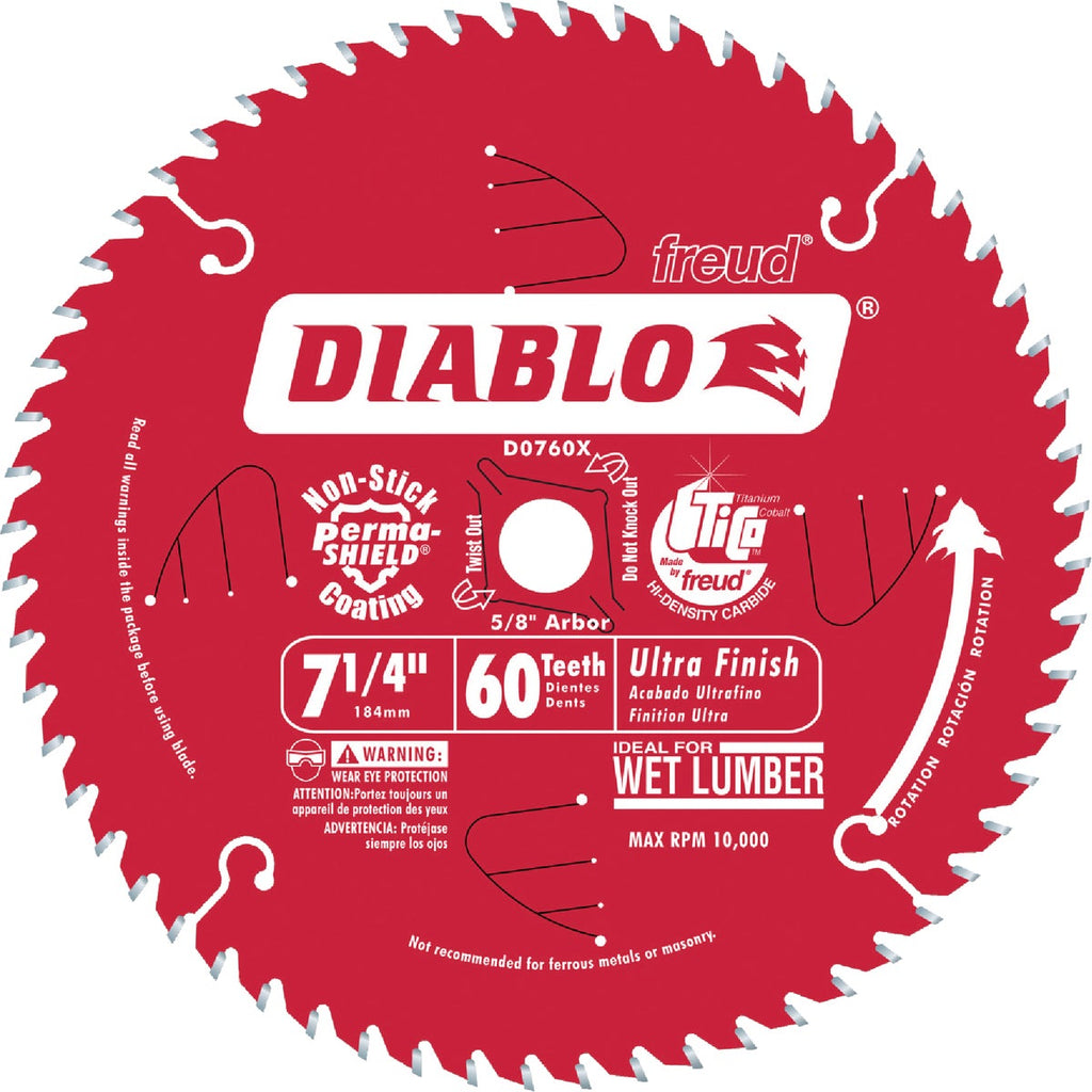 Diablo's finishing blade is ideal for smooth finish crosscuts in hardwood, softwood or plywood. These blades are the perfect choice when seeking high quality rips and crosscuts using a portable saw. The combination of Diablos application specific TiCo Hi-Density carbide teeth and a super thin-kerf blade deliver smooth cuts, increased cutting speed and longer life. A great choice for jobsite finish cuts in 1X, decking, fencing, fascia and plywood. Specially formulated Diablo TiCo Carbide withstands impact, reduces wear and lasts longer in fine finish applications. Perma-SHIELD non-stick coating protects the blade against heat, gumming and corrosion. Advanced Laser Cut Stabilizer Vents traps noise and vibration for maximum stability, keeping the blade cool with accurate cuts in wood. Super Thin Kerf Design provides less resistance and heat build-up for ease of cut, accuracy and longer cutting life. Tri-Metal Hock Resistant Brazing provides a high performance shock absorber behind every tooth. Laser Cut Arbor reduces vibration and premature wear for accurate blade rotation on cordless and corded saws.