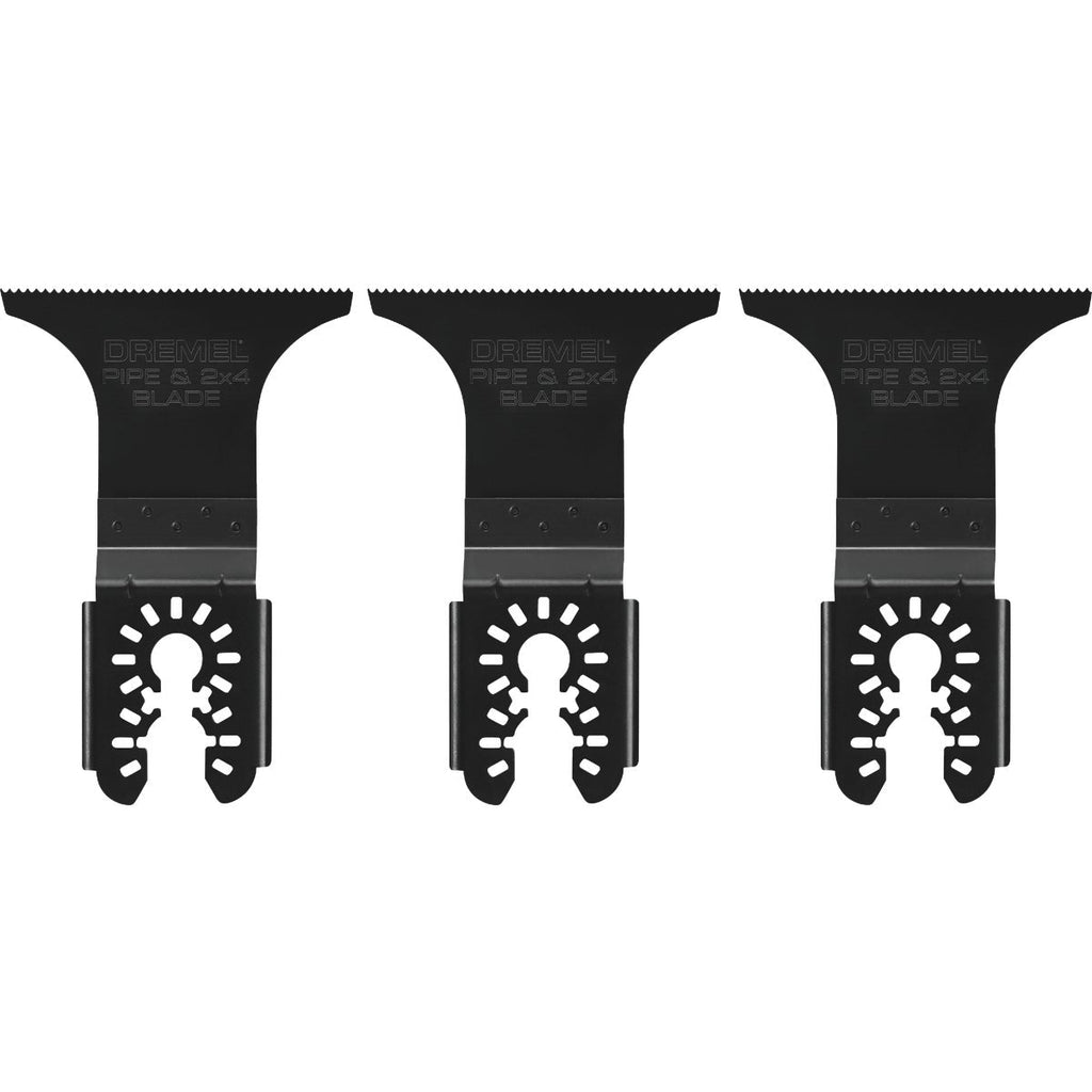 The Dremel MM494BU pipe and 2 x 4 blade is made for cutting pipe and thick materials such as 2 x 4 studs. With an extra wide cutting edge, the MM494BU adds control and convenience because users can now easily cut PVC, conduit and copper pipe without the blade slipping off of the work-piece. Cuts through a 2 x 4 can now be done in one pass as well. The blade's Bi-Metal construction optimizes the MM494BU for metal cutting, so you'll experience no more destroyed teeth if you hit a nail while cutting. The Dual Interface allows its use with the most common oscillating tools in the market without the need of an adapter. Includes (3) MM494U 2-3/4 In. bi-metal/wood oscillating blades.
