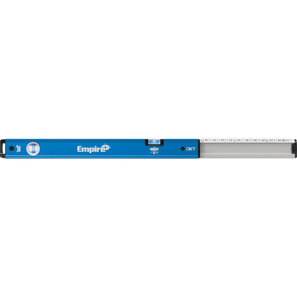 The Empire True Blue Extendable Box Level offers the most versatile performance with the ability to extend for exact fit in any job. This level allows for a perfect fit in custom or odd size applications and constant surface contact for an accurate read across the full length of material. The adjustable sizing allows users to carry less, but do more with the ability to replace up to three level sizes and maintain productivity with this all-in-one solution. Empire's patented e-Band Vial Technology provides superior readability and reliable 0.0005/in accuracy. The mark & scribe edge allows for continuous scribing across the full length of the level, even when extended. The adjustable extension mechanism allows for customizable friction fit resistance and long term performance. The Empire True Blue Extendable Box Level offers leading versatility and accuracy for all tradesman and the applications they face on a day-to-day basis.