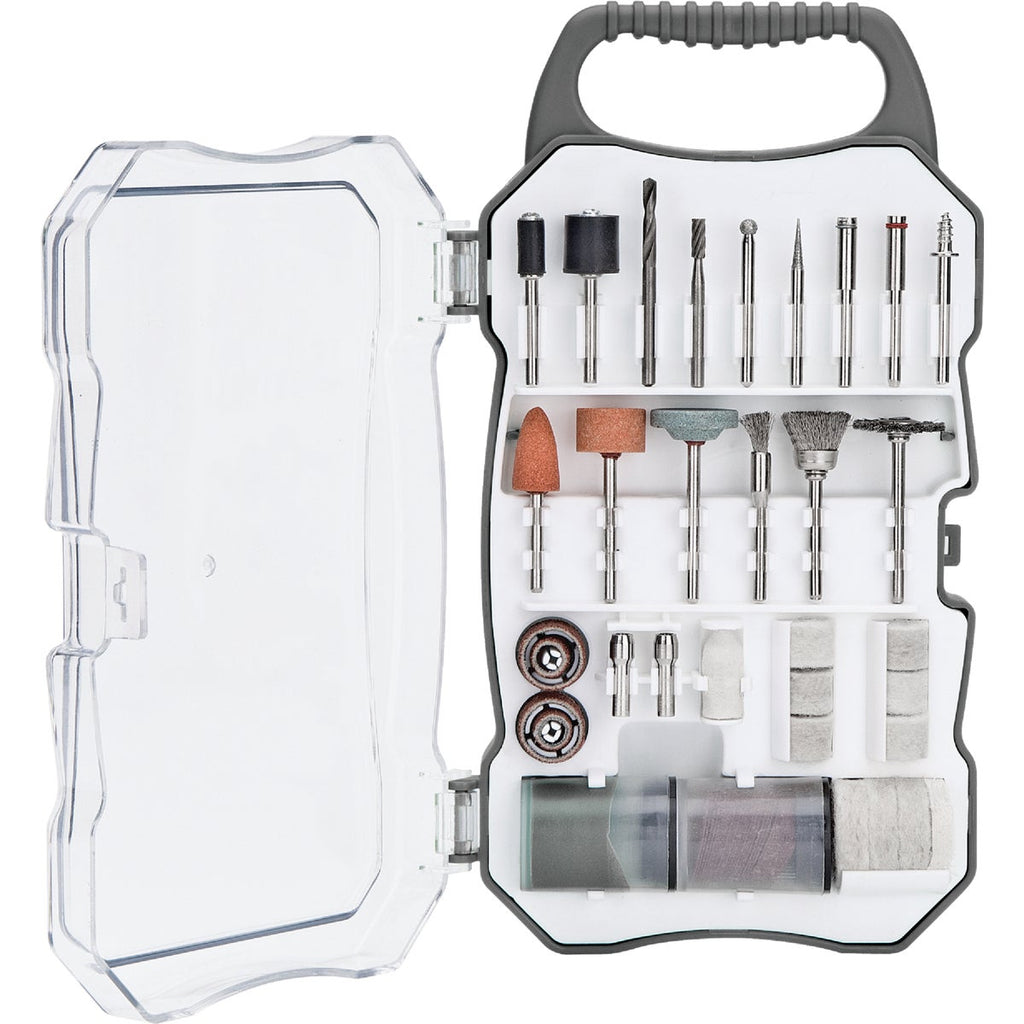70-Piece rotary tool accessory set will cut, saw, sand, grind, drill, polish, buff, sharpen, clean, and more. Accessories fit all standard rotary tools. Durable clear plastic storage case with carrying handle. Includes: (2) Sanding Bands 1/4 x 1/2 In., (2) Sanding Bands 1/2 x 1/2 In., (3) Polishing Felt Wheels 1 x 1/4 In., (6) Polishing Felt Wheels 1/2 x 3/8 In., (1) Polishing Felt Point 3/8 x 3/4 In., (1) Cloth Wheel 1 x 1/8 In., (1) Stainless Steel Cup Brush 3/16 In., (1) Stainless Steel Cup Brush 1/2 In., (1) Stainless Steel Wheel Brush 13/16 In., (1) Sanding Band Mandrel 1/4 In., (1) Sanding Band Mandrel 1/2 In., (1) HSS Drill Bit 1/8 In., (1) HSS Cylindrical Cutter 1/8 In., (2) Diamond Grinding Points 1/8 In., (3) Mandrels, (37) Cut-Off Abrasive Wheels 15/16 In., (1) Storage Case, (1) Polishing Paste, (2) Collets 1/8 In., (1) Aluminum Oxide Parabolic Wheel 3/8 x 3/4 In., (1) Aluminum Oxide Grinding Wheel 5/8 x 3/8 In., (1) Silicon Carbide Grinding Stone 25/32 x 5/32 In.