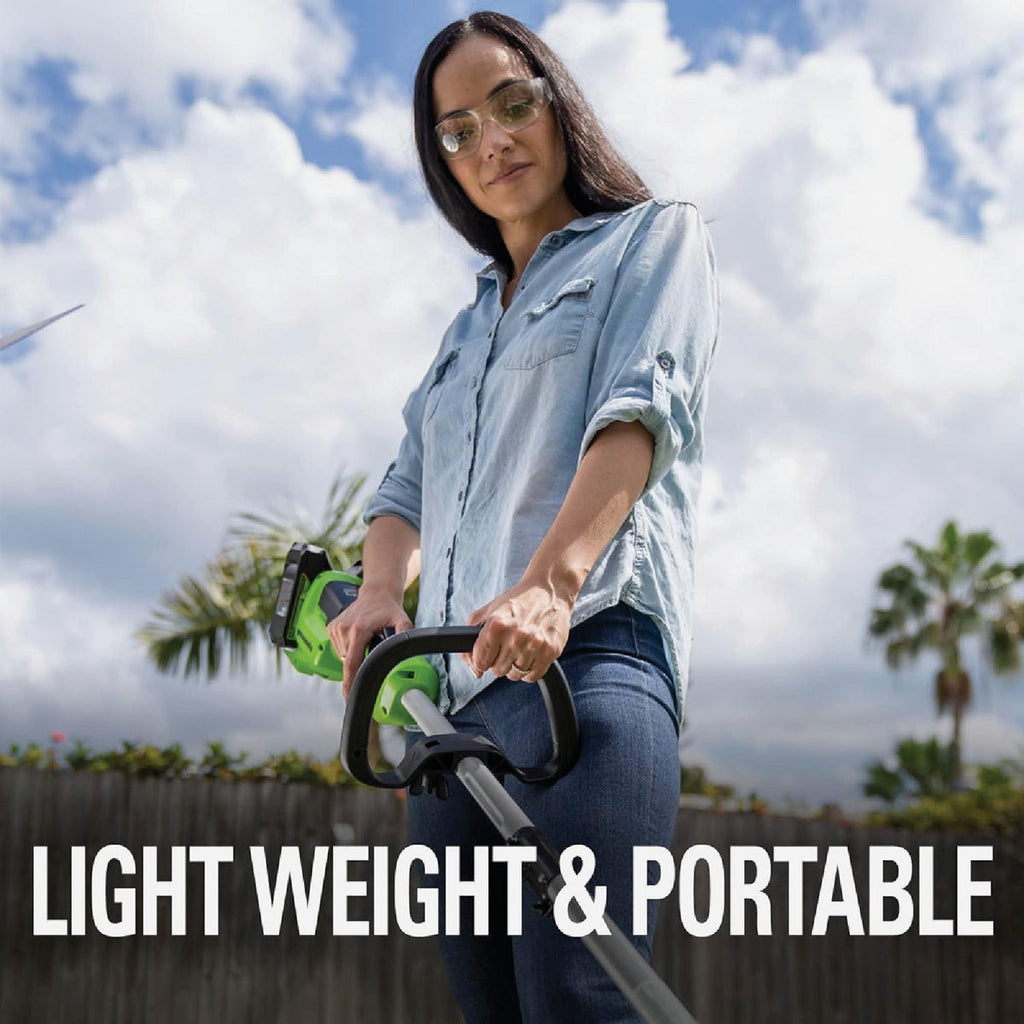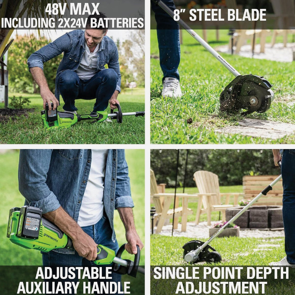 Introducing the Greenworks 2 x 24V battery-powered 8 In. Brushless Edger, the perfect tool for creating a pristine and manicured lawn. With its powerful brushless motor, this edger provides superior performance, making it easy to achieve clean and precise edges on your lawn. Made with high-quality materials, the Greenworks 8 In. Brushless Edger is designed for durability and longevity, ensuring that you can use it season after season. Featuring an 8 In. blade and a brushless motor, this edger delivers exceptional cutting power with minimal vibration, resulting in a cleaner and smoother cut. Magnesium motor housing for maximum durability to protect against motor wear. Adjustable auxiliary handle to easily accommodate users of different heights for maximum comfort and ease of use. The edger also includes a cutting depth adjustment feature, allowing you to customize the depth of your cut for optimal results. The Greenworks 8 In. Brushless Edger is also incredibly easy to use, with its ergonomic design and user-friendly controls. It is lightweight and easy to maneuver, making it ideal for both small and large yards. Includes (2) 4.0 Ah batteries and charger.