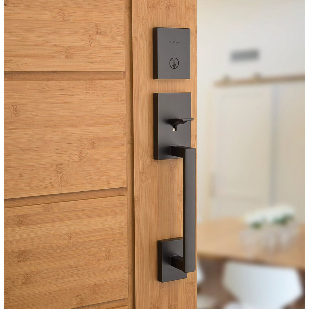 Kwikset Signature Series San Clemente Matte Black Entry Door Handleset with Smartkey & Halifax Lever