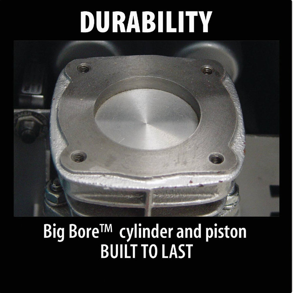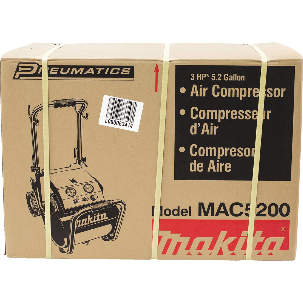 Makita's 3.0 HP Air Compressor is equipped with Makitas Big Bore engineered pump cylinder and piston for higher output for two nailers, with less noise and improved jobsite performance. The MAC5200 delivers industrial power and results with improved durability and includes rugged wheels and folding handle for easy transport. The MAC5200 is powered by a 3.0 HP motor with built-in thermal overload for additional protection. The Makita Big Bore engineered pump with cast iron cylinder has greater bore and stroke for increased compression, faster recovery and less noise. The cast iron construction is engineered for increased durability even under tough job site conditions. The MAC5200 has an oil lubricated pump and is equipped with a large automotive style filter for increased air intake and greater efficiency.