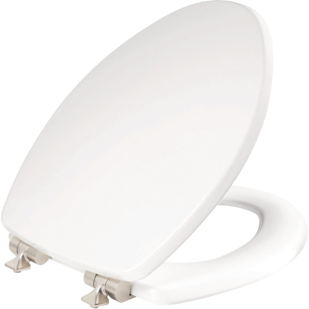 Mayfair Benton Elongated White Enameled Wood Toilet Seat with Slow Close Brushed Nickel Metal Hinge