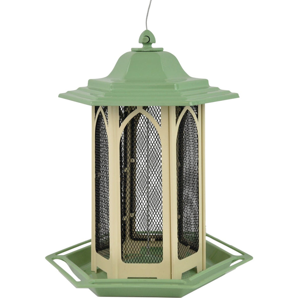 Make your backyard the go-to hangout spot for wild birds with the Perky-Pet Pistachio Gazebo feeder. This feeder boasts a wraparound seed tray that allows birds to perch anywhere around the feeder. It also prevents messes by helping to catch dropped seeds. With the ability to hold up to 3.5 pounds of mixed seed, your favorite backyard birds won't be able to resist flocking to your yard. In addition to offering features birds love, this feeder also makes a charming addition to any outdoor setting with its quaint gazebo-style design. For your convenience, the wide-mouth opening ensures easy filling and cleaning. The patented Sure-Lock cap locks the lid in place to keep squirrels out of the reservoir. Built-in drainage holes in the tray allow proper air flow to prevent water from settling so the seed stays dry for no more seed waste. The metal lid and mesh windows offer additional squirrel resistance, while the metals powder-coated finish prevents rust. You can be sure this feeder will remain a focal point in your yard for years to come.