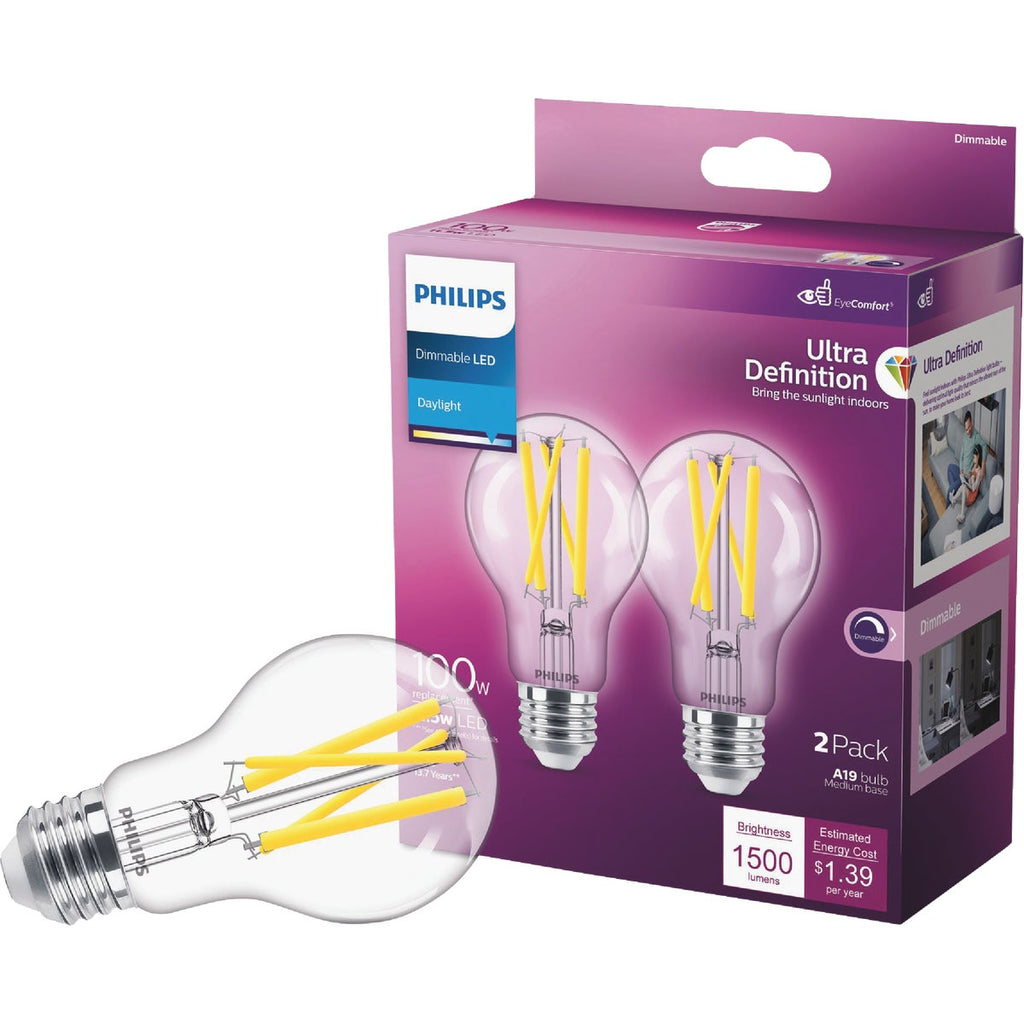 Philips Ultra Definition 100W Equivalent Daylight A19 Medium Dimmable LED Light Bulb, Clear (2-Pack)