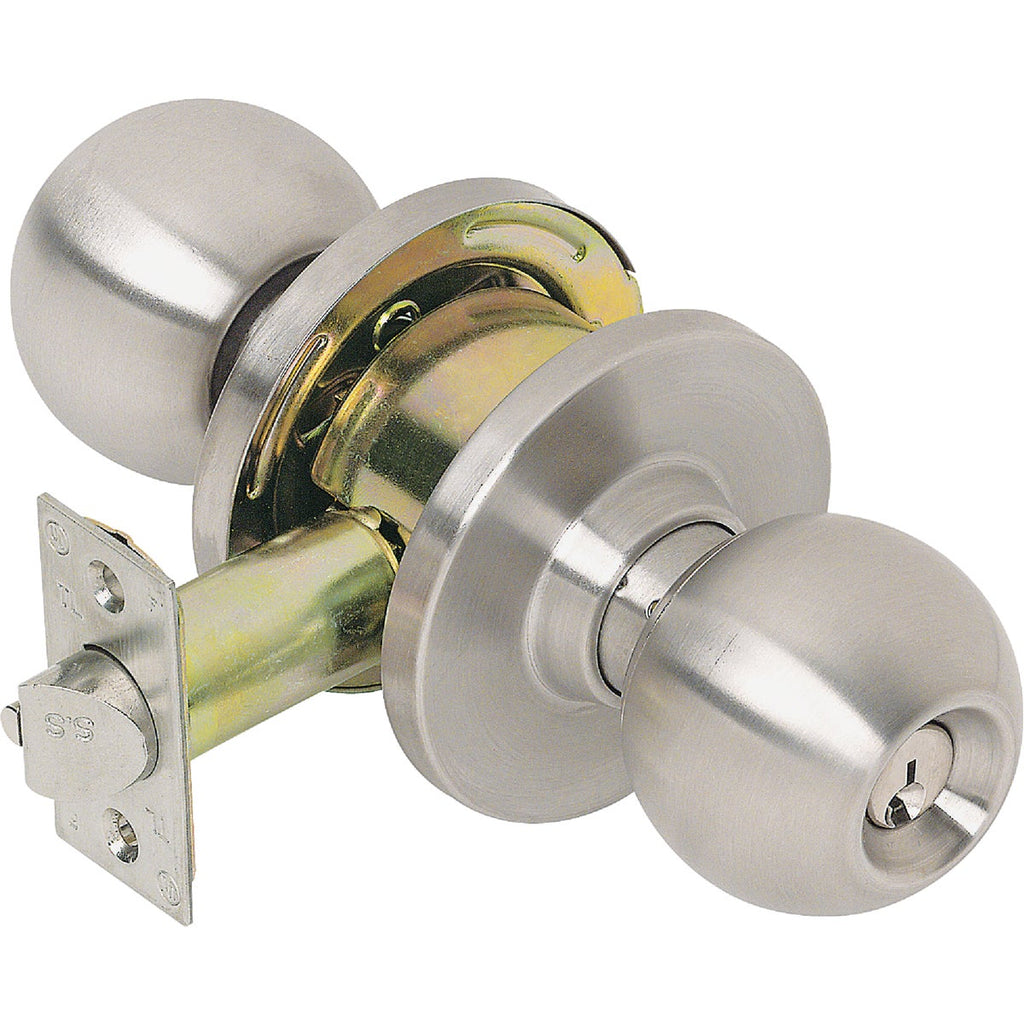 (KC2381). Heavy-duty commercial entry ball knob. Satin stainless steel (32D) finish. Performance: Complies with ANSI A156.2. Series 4000, Grade 2 (400,000 cycles), UL listed for 3 hour fire door. Keying: 6 pin SCC keyway with 2 nickel keys per lock. Door range: 1-3/8" to 1-3/4". Backset: 2-3/4" standard. Strike: T strike (1-1/8" x 2-3/4") standard. Cylindrical, steel-coated with zinc dichromate (corrosion resistance). Latchbolt operated by knob on either side. Outside knob locked by push-button from inside. Unlocked by key from outside or rotating inside knob. When knob locked by push and turn button from inside, key from outside or rotating inside knob does not unlock outside knob. For keyed alike, member must order directly from vendor.